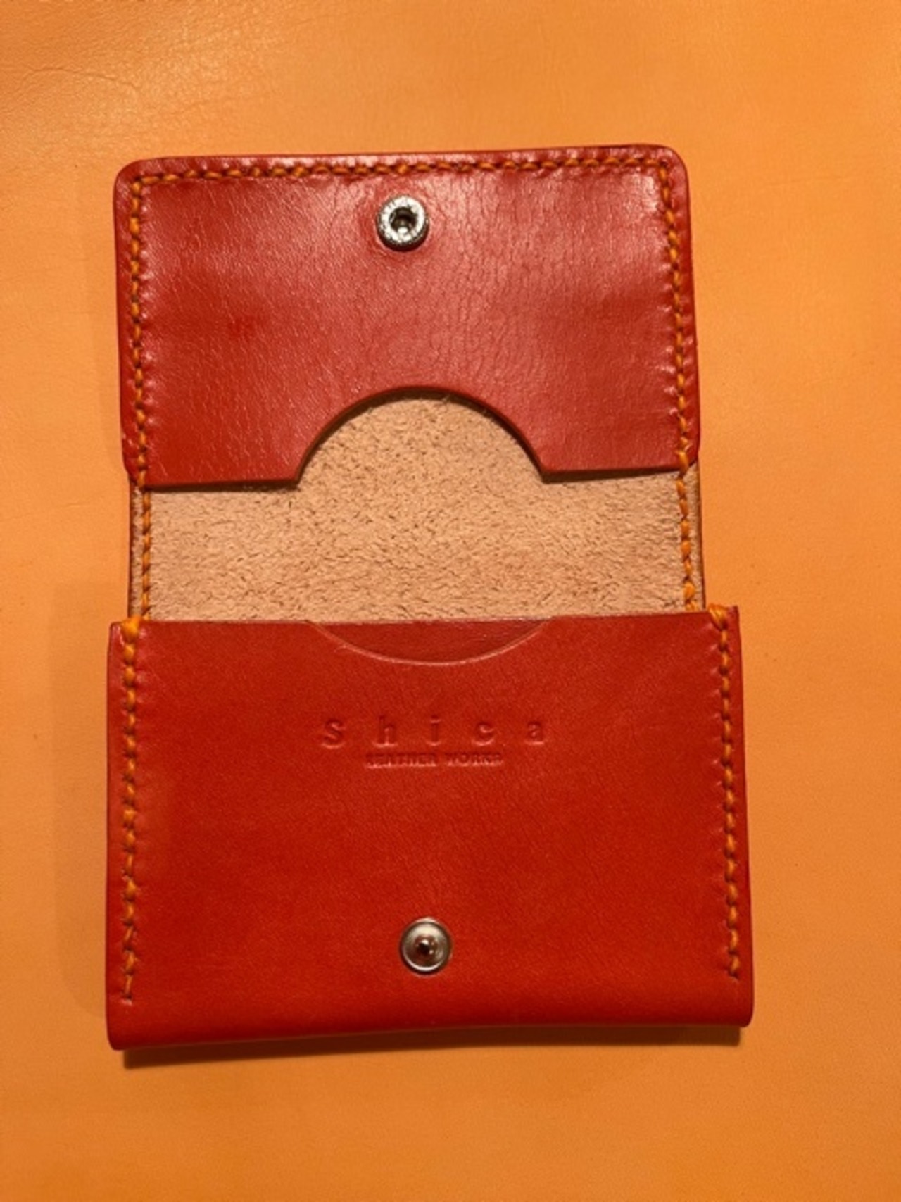 オリジナルブランド shica leather works のロゴが刻印されています。