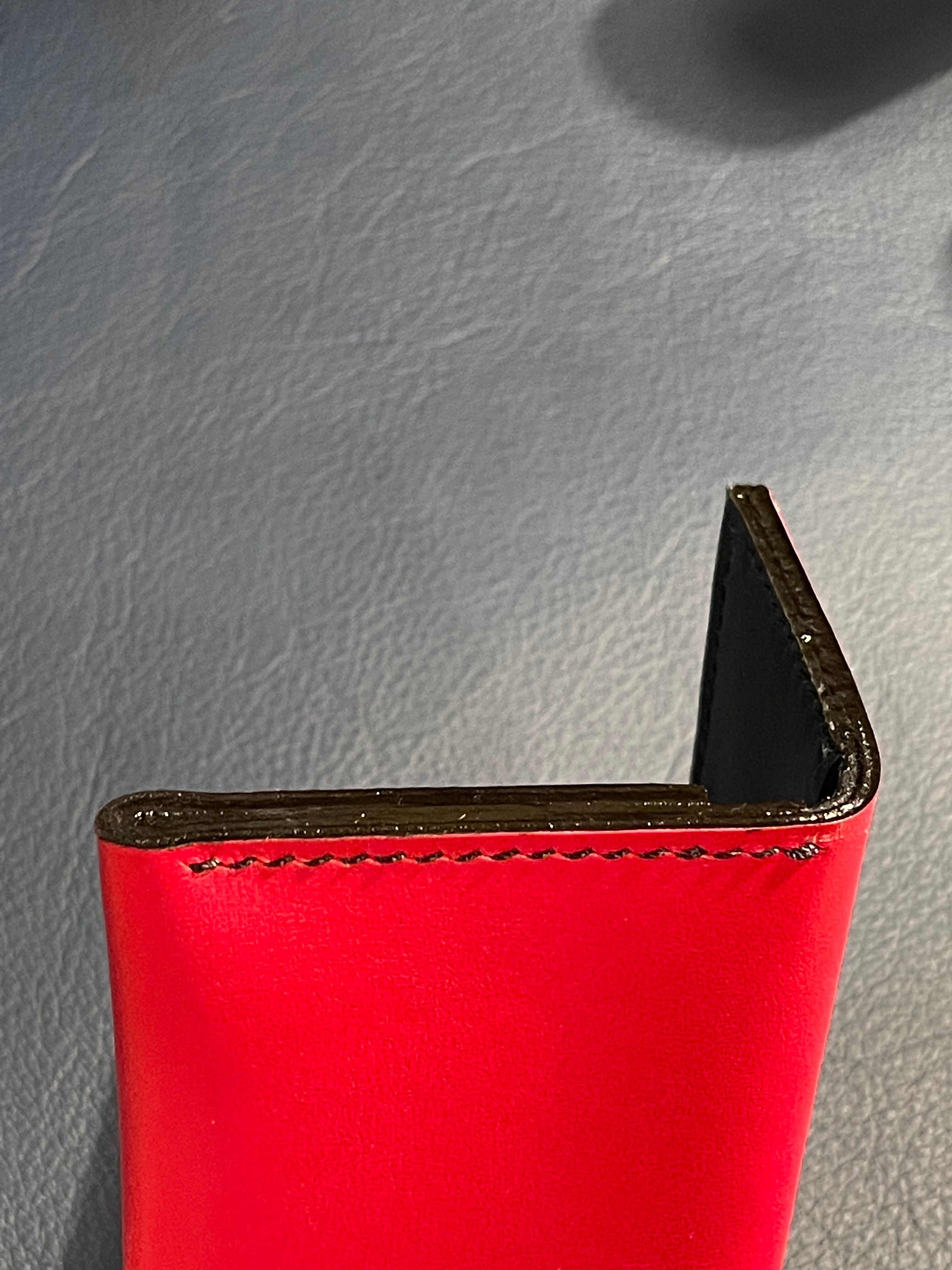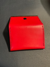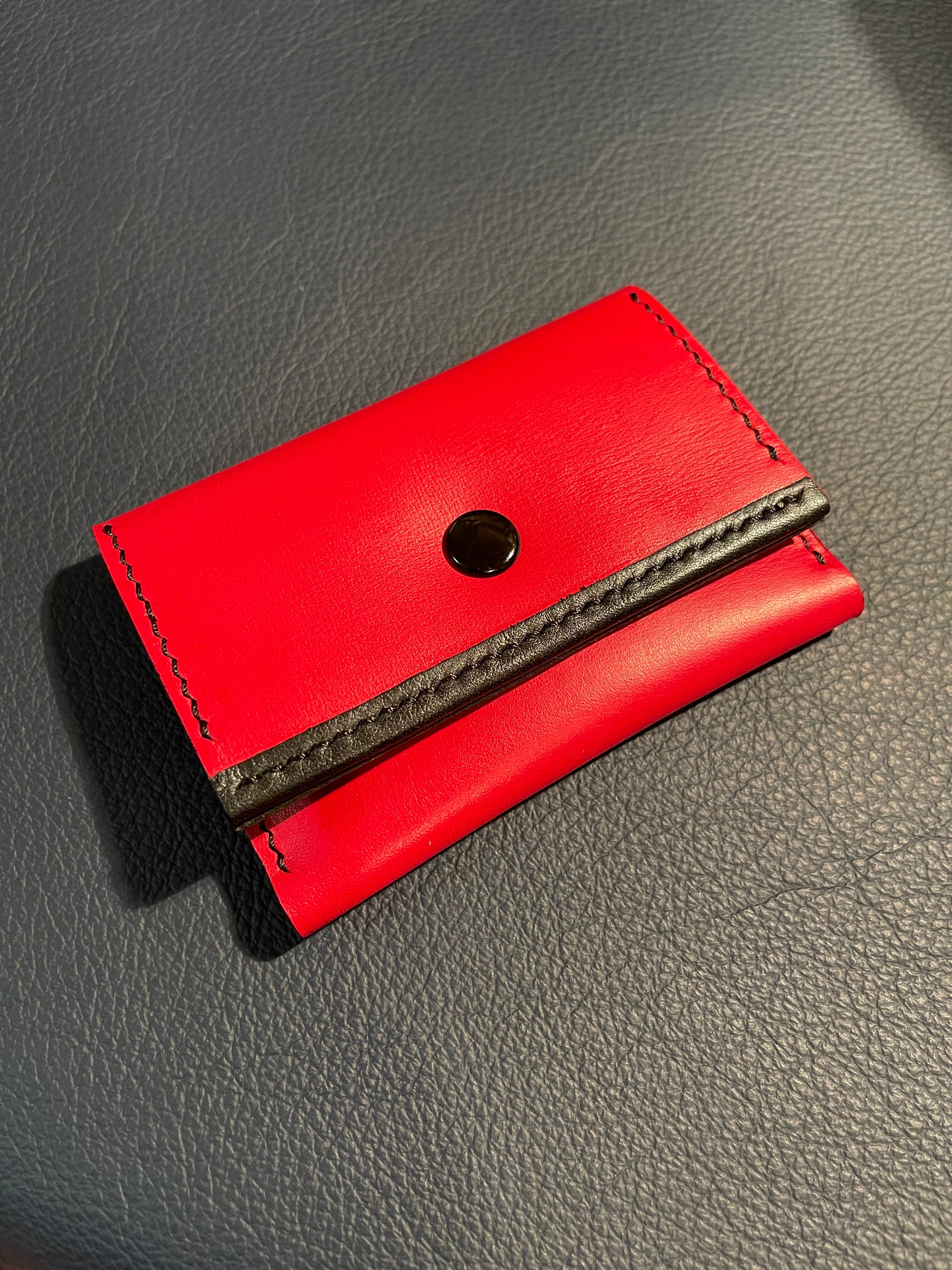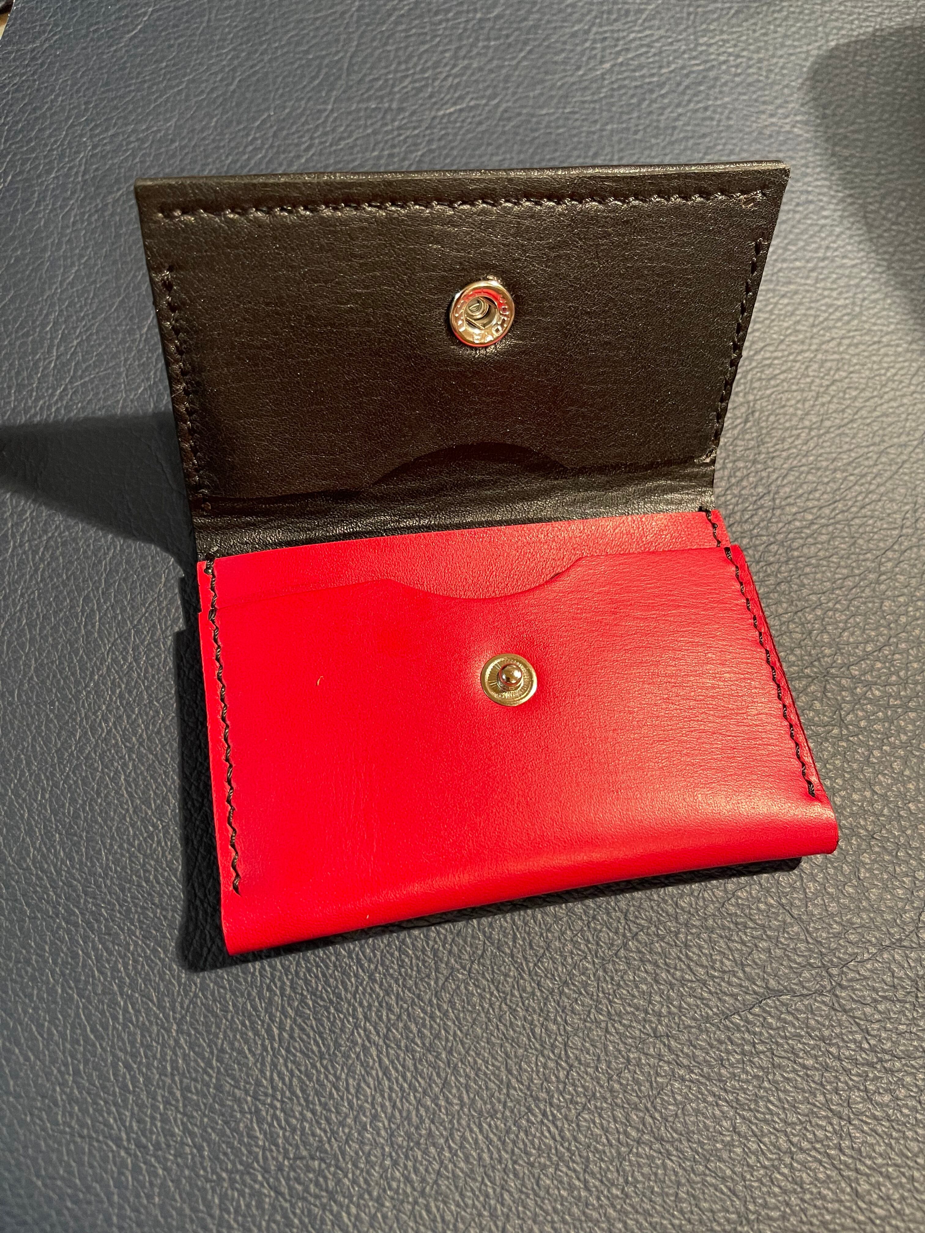 赤と黒の上質な牛革をコンビネーションで仕上げたカードケースになります。マチは無いですが、名刺であれば20枚以上は入ります。ポケットは3つありますが、上蓋のポケットはホックが付いているので、カード類は入りませんが、コインやメモなどを入れられます。