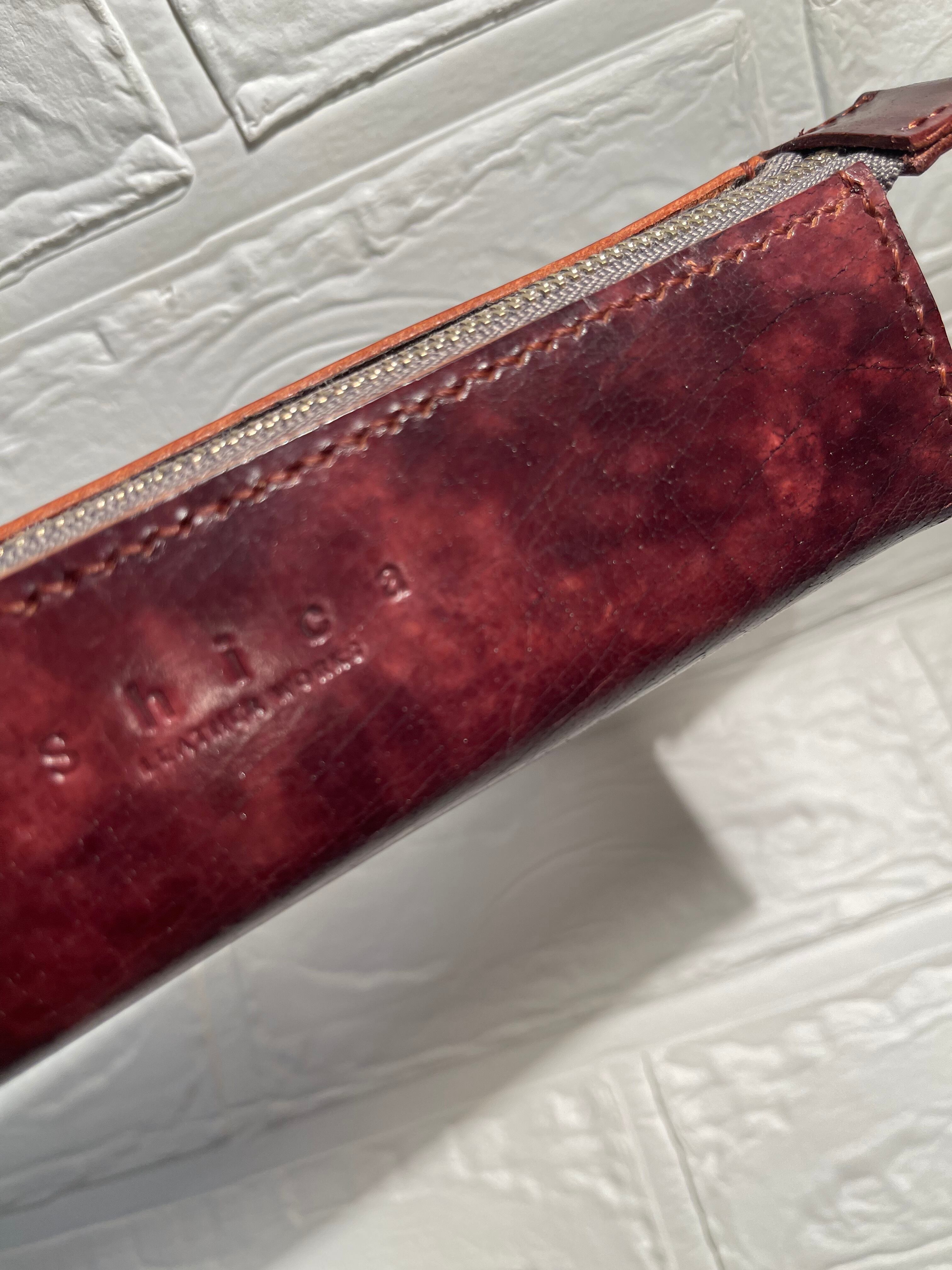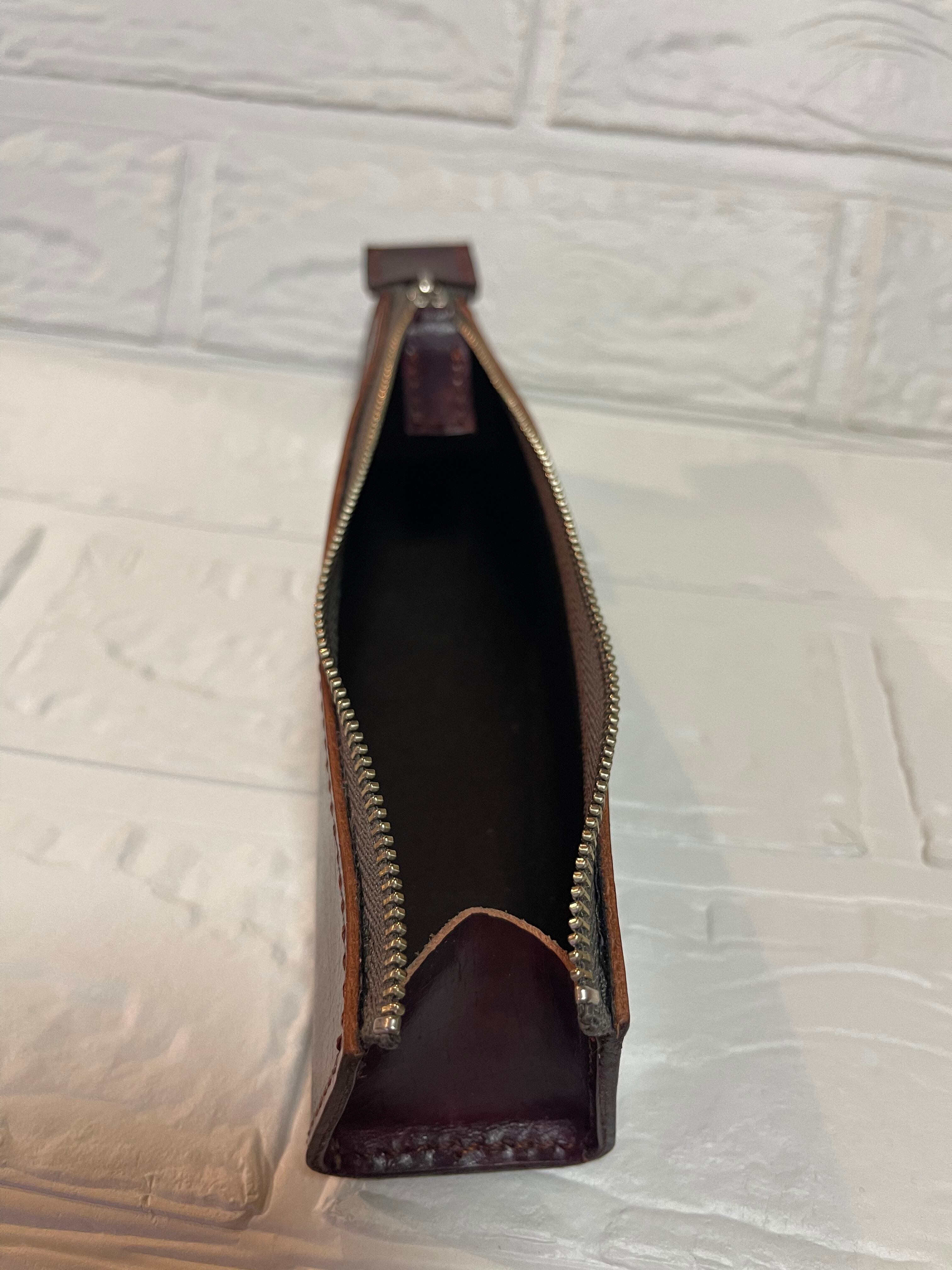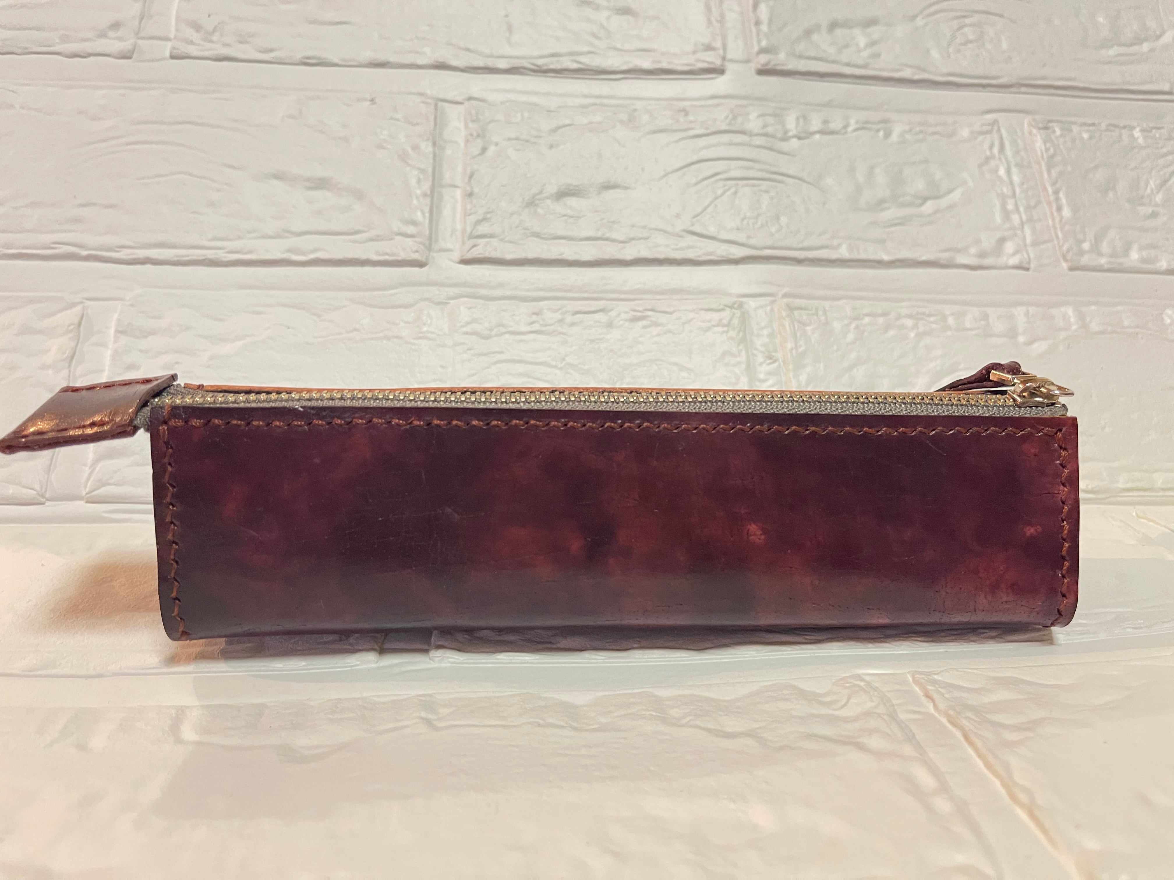アンティーク調に染め上げたヌメ革を使ったペンケースになります。