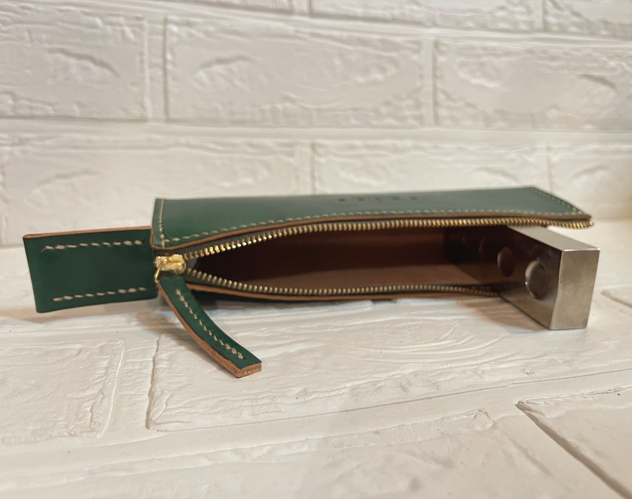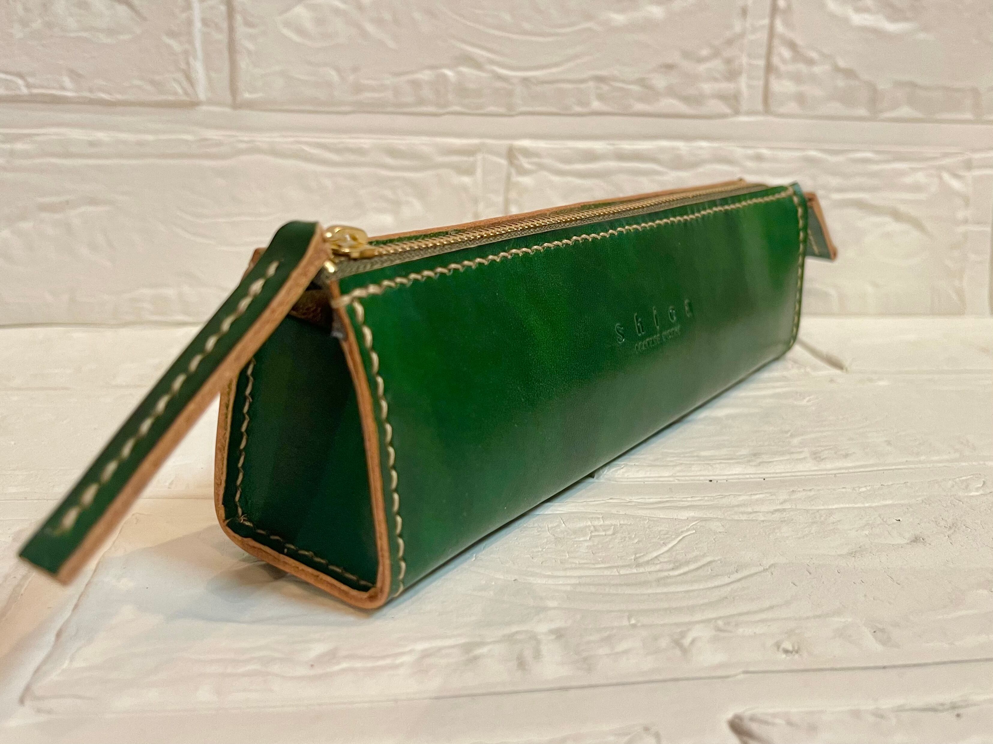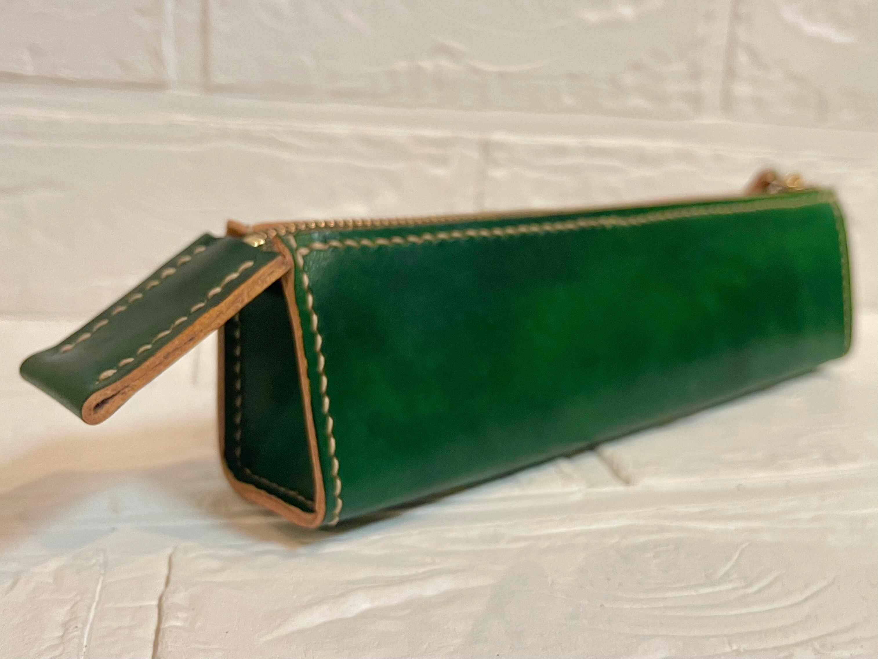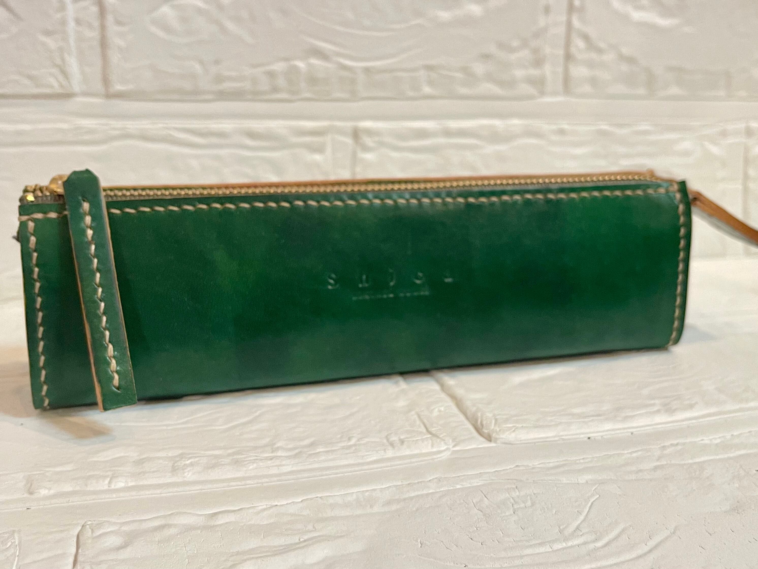 アンティーク調に染め上げたヌメ革を使ったペンケースになります。