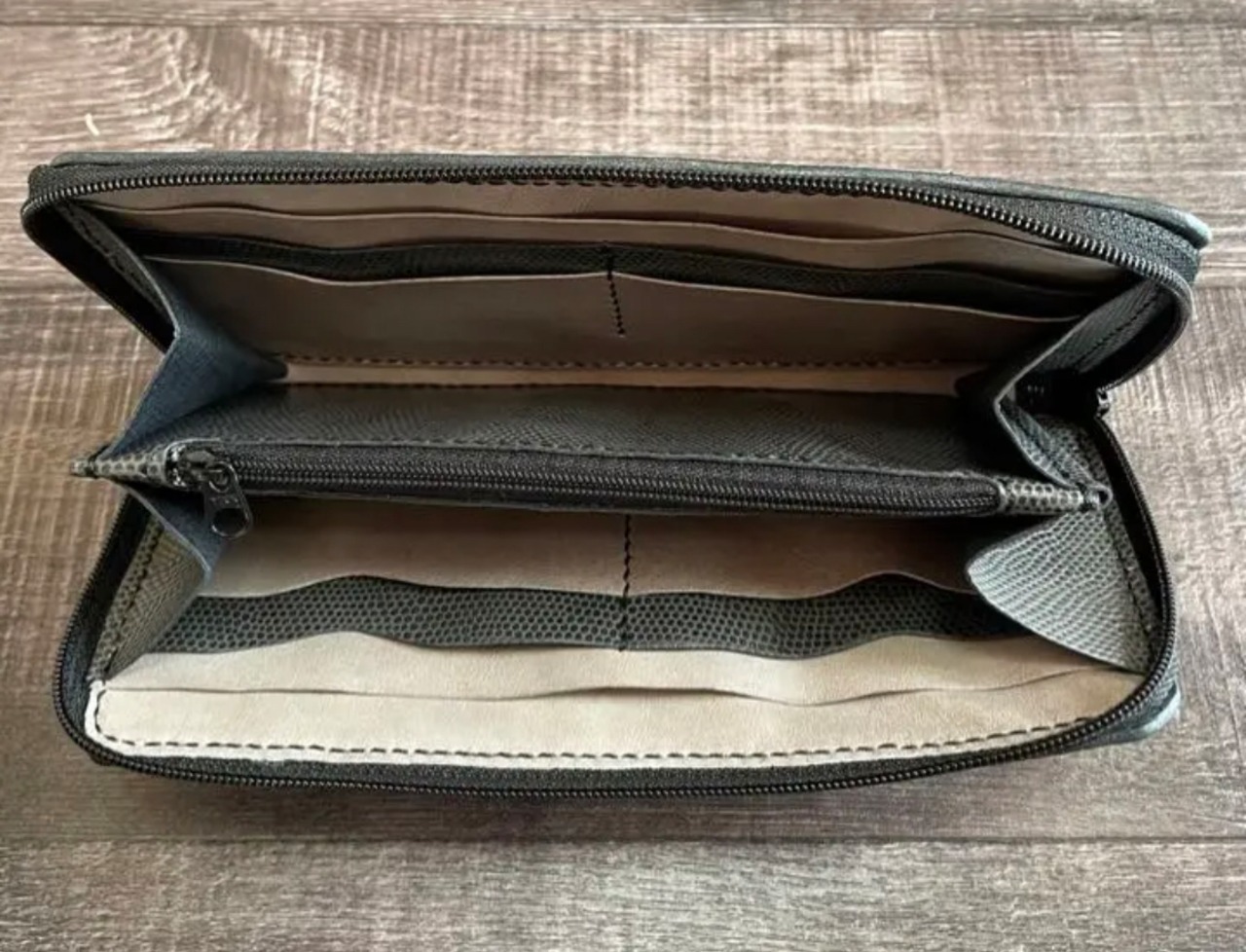 内側は淡いグレージュとブラックの型押しレザーでアクセントを入れて作りました。
